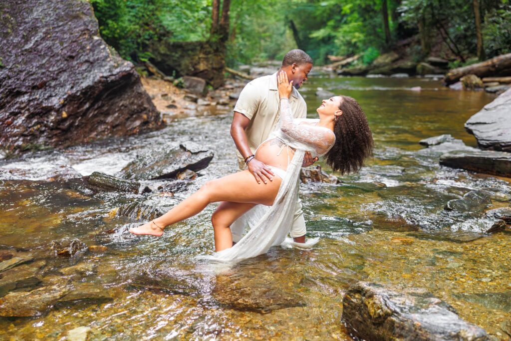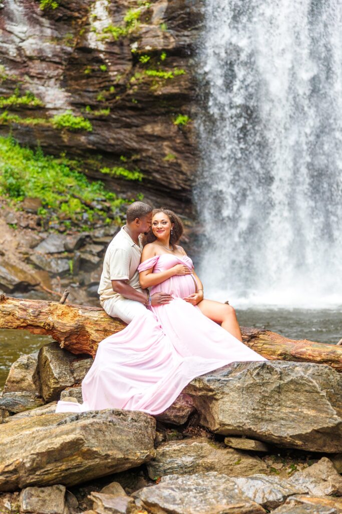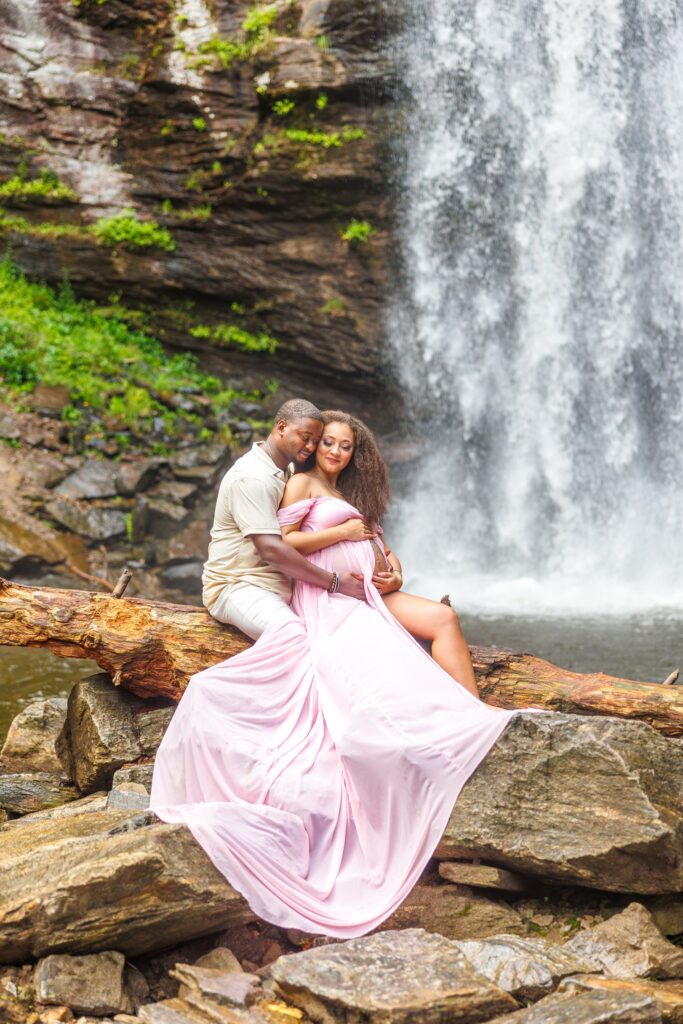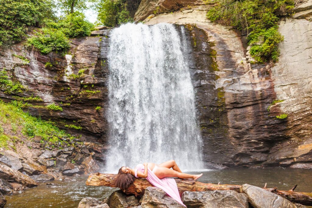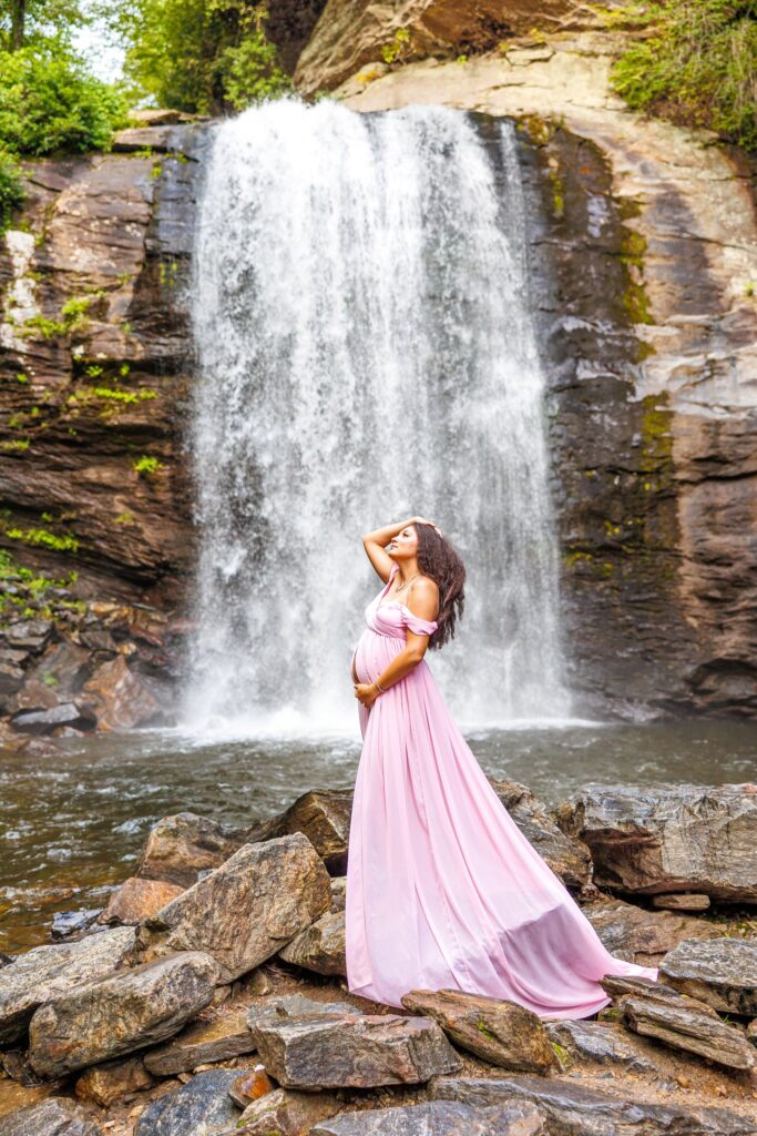 The day of the session, we were apprehensive due to the weather. NC weather has a mind of its own, especially, weather in the mountains. On our way to the waterfalls, we were in a torrential downpour. The roads were flooded in several areas and I did not think we were going to be able to do the session. After a treacherous ride, I was pleasantly surprised to see that the rain had not affected the falls at all. It was almost as if the storm had gone around them and we were able to continue with the session!