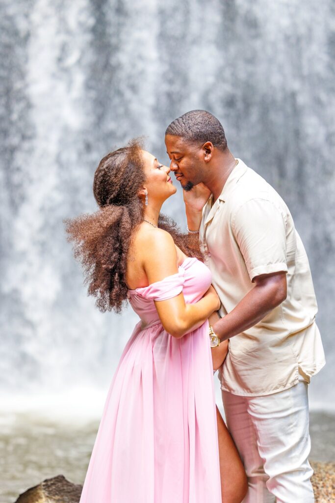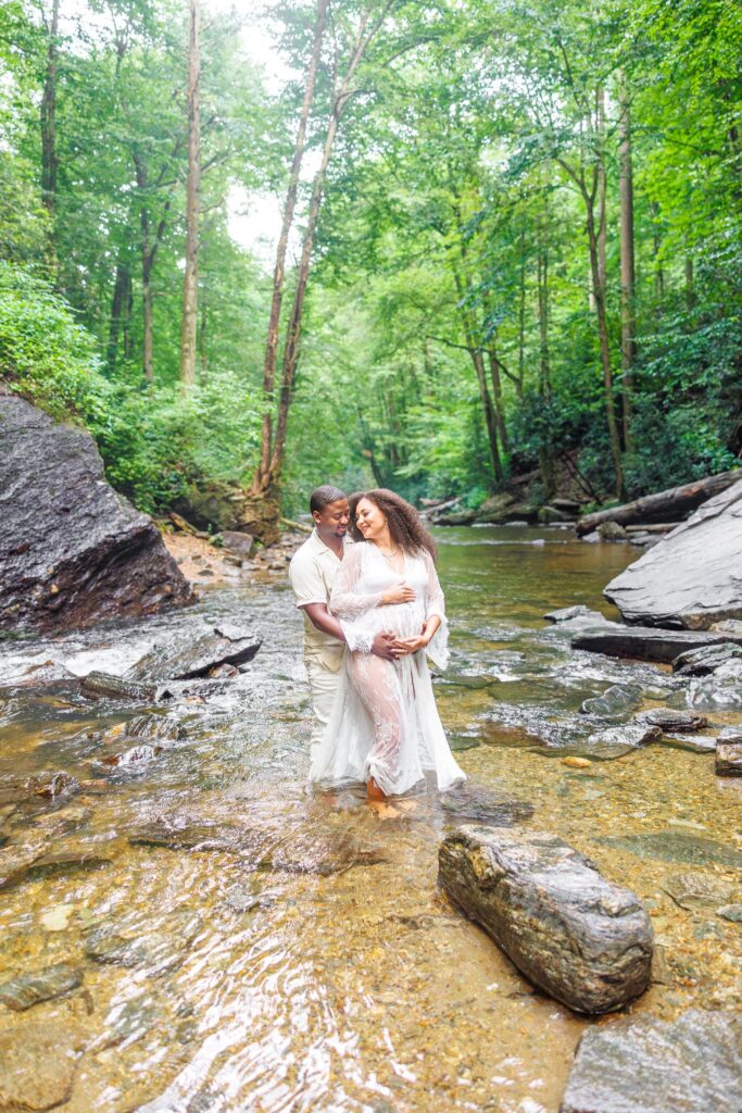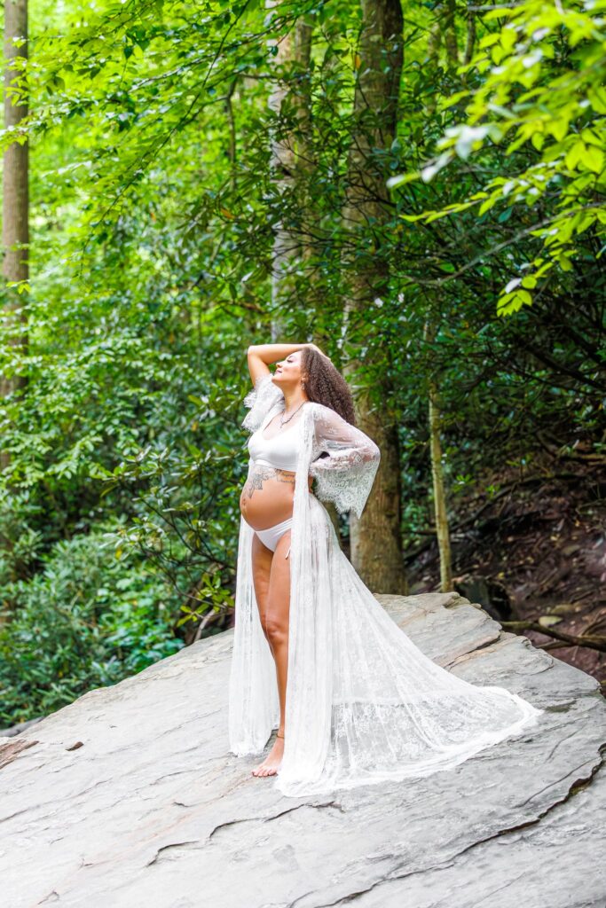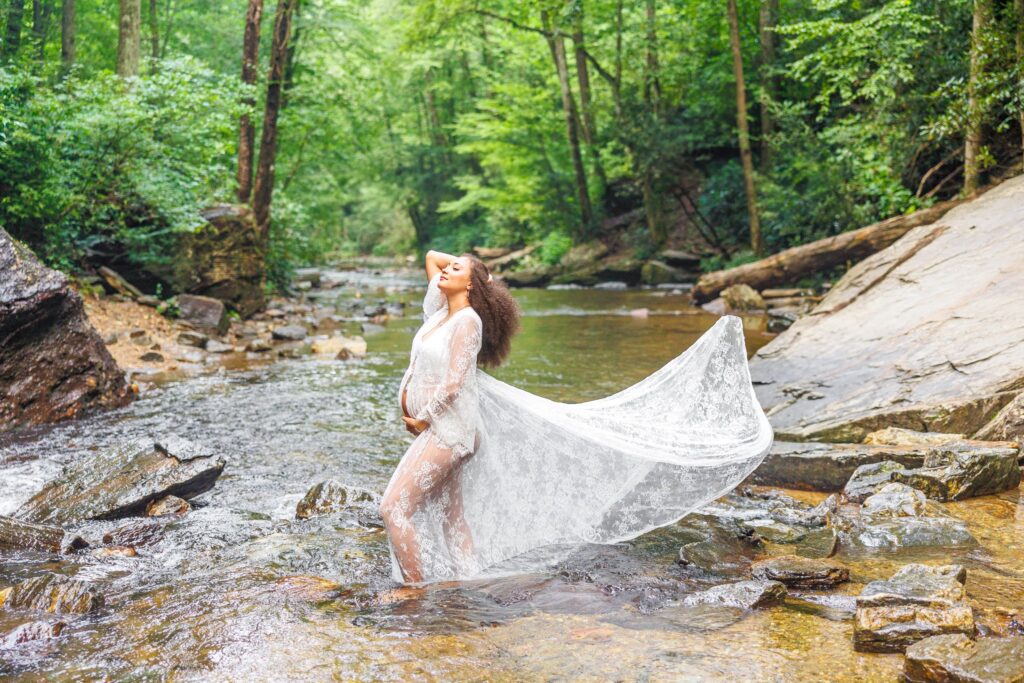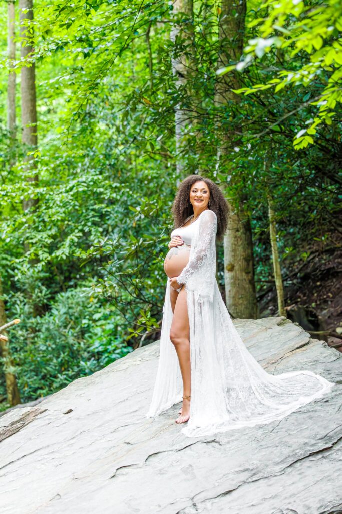 The day of the session, we were apprehensive due to the weather. NC weather has a mind of its own, especially, weather in the mountains. On our way to the waterfalls, we were in a torrential downpour. The roads were flooded in several areas and I did not think we were going to be able to do the session. After a treacherous ride, I was pleasantly surprised to see that the rain had not affected the falls at all. It was almost as if the storm had gone around them and we were able to continue with the session!