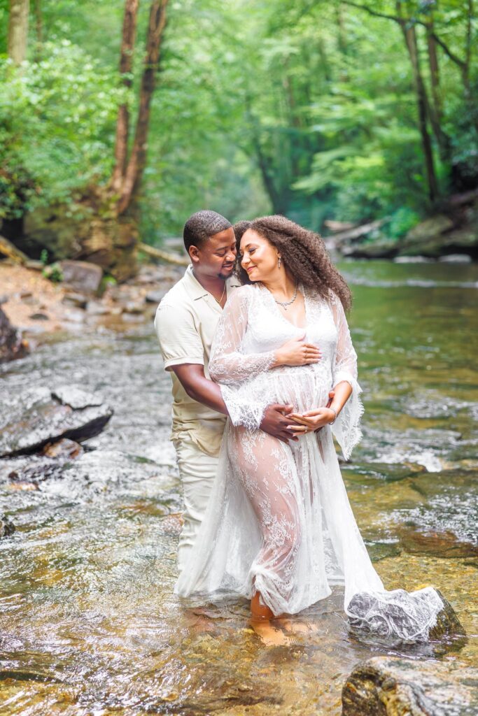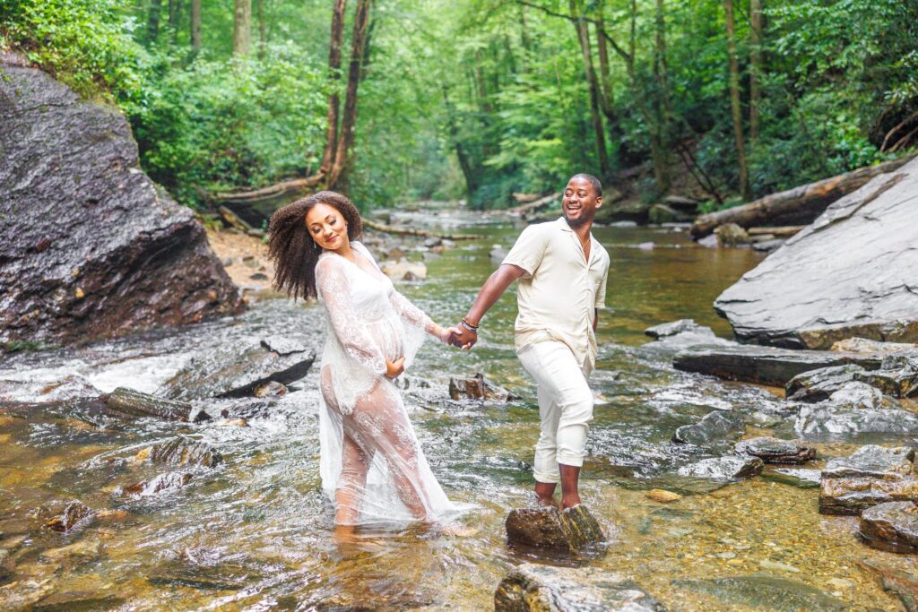 Brittney asked me if it would be a crazy idea to do her maternity session at a waterfall. Naturally, I was 100% onboard and so excited! We began the search for the best location. A friend of her’s suggested Looking Glass Falls in Brevard, NC (about an hour outside of Asheville) due to it’s accessibility. After researching more about the area, we thought it was the perfect fit!