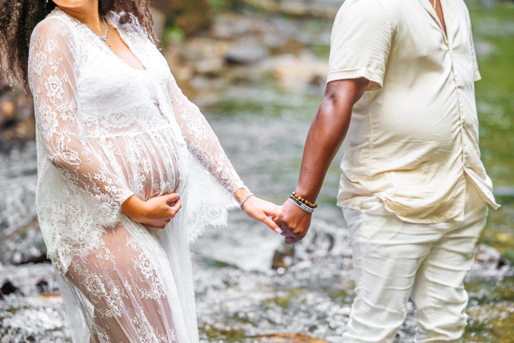 This waterfall maternity session at Looking Glass Falls is close to my heart and I am so excited to share more about it! I met Brittney and Brodrick five years ago when we became neighbors. Those neighbors quickly became friends and then family. I captured their couple photos when they were dating, their engagement session, wedding, maternity, and more.